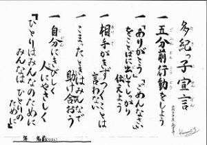 高学年の話し合い活動で、多紀っ子みんなが楽しく学校生活が送れるように…との思いを込めて「多紀っ子宣言」を決めました。そして3学期の始業式に児童会が全校生に紹介し、児童会役員による手書きの「多紀っ子宣言」を配布しました。今後、全校に広めていき、高学年の思いを次年度へもつなげていきたいです。