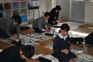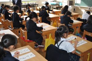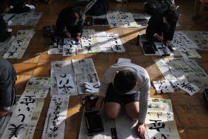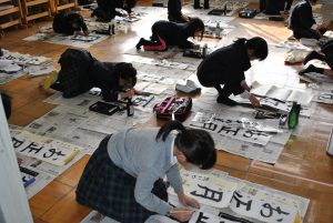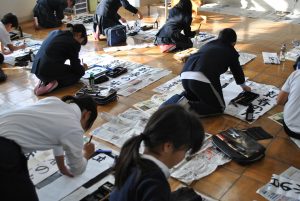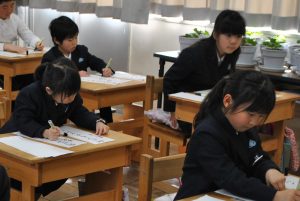 1月8日(火)、新春書き初め大会をしました。「書き初め」とは、年が明けて初めて毛筆で書や絵をかく行事です。1年生は「なかよくあそぶ」2年生は「何にでもチャレンジ」3年生は「お正月」4年生は「美しい空」5年生は「新春の光」6年生は「伝統を守る」という字を書きました。一筆ずつ気持ちの入った字を書けたようで、出来上がった作品を見て、「やったぞ!」と目を輝かせながら、自分が書いた字を眺めていました。心落ち着かせ集中し、とてもいい雰囲気の中で新春書き初め大会を行うことができした。作品は、1月25日(金)の午後のオープンスクール時に、校内に展示します。ぜひ、ご覧になってください。
