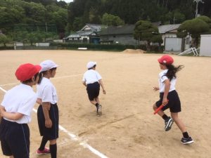 ゴー!ハイッ!!・・・やったー! 2019年5月17日 に takihp_mng が投稿 4月下旬から、4年生はバトンパスを練習しています。少しずつ上達していく様子が見られ、成功するとハイタッチをして大喜びする様子が見られます。流れるようなバトンパスを目指し、まだまだ頑張ります。(4年)