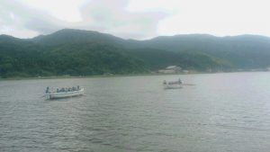 午前中はカッター体験をしました。12人が1つのカッターに乗り、声を合わせて円山川に漕ぎ出しました。気持ちを1つにして上手に漕ぐことができました。