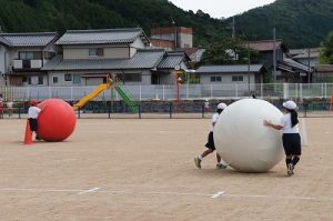 9月5日(木)、運動会練習で、1・2年生の大玉ころがし「コロコロ大作戦」の練習を行いました。1・2年生のペアで、自分たちのからだよりも大きな大玉をがんばって運びました。2年生が上手にリードしてくれたおかげで、1年生も楽しく取り組むことができました。「もっところがしたーい!!」とやるきいっぱいの1・2年生です。