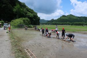 5/27(金)に農業委員の粟野勝浩さんにお世話になり、田植えを行いました。気持ちよさそう田んぼに入り、力を合わせて植えました。子どもたちは「大変だったけど、みんなで楽しく植えることができた」と感想を持ちました。これから稲刈りまで成長を見届けたいです。