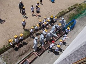 5月12日(金)にゲストティーチャーとして、東雲高等学校の生徒さんや先生に来ていただき、丹波篠山市の名産品『山の芋(種芋)』を植えました。土に肥料を混ぜ、『山の芋』にそっと土をかぶせました。緑のグリーンカーテンとおいしい『山の芋』ができるように3年生みんなで世話をがんばります。
