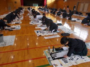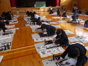 1月11日は、校内書き初め大会がありました。3~6年生は、体育館で筆を使い画仙紙に学年ごとの課題を書きました。3年生の課題は、「明るい心」です。全体のバランスや書く文字が大きくなり過ぎないように気をつけ、たいへん集中して取り組むことができました。学校や冬休みにお家で練習してきた成果を発揮することができました。