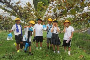 2学期が始まり、1か月が過ぎようとしています。1年生は元気に運動会練習をすすめています。もちろん、学習にも前向きに取り組んでいます。2学期スタートの9月4日(木)には、さっそく校区の校外学習へでかけました。校区内に『ぶどう畑』があることを発見し、見学できることを楽しみにしていた1年生たち。あたたかい地域の方のご支援により、楽しく見学をさせていただきました。「次は…!」自分たちの校区について、どんどん知ろうとしています