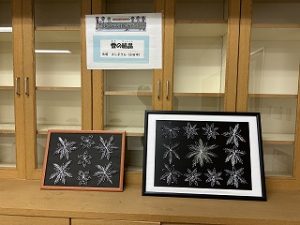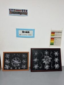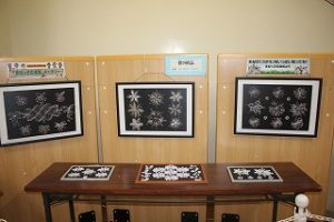 現在、4月の展示として、小田中にお住まいの北尾よし子様よりご提供いただいた、繊細で美しい「雪の結晶」の壁掛けを展示しております。児童も足を止め、「どうやって作られているのかな」と興味深く鑑賞しています。