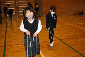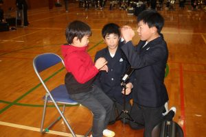 12月19日、人権擁護委員協議会・高齢者・障がい者委員会の方々に来ていただき、パラリンピックの競技にもなっている「ボッチャ」を体験しました。全員が初めての体験でしたが、ルールも分かりやすく、大盛り上がり。カーリングによく似た競技で、最初は、ただ投げていただけでしたが、最後には相手の球をはじいて遠くに転がすなど、どうすれば勝てるのか、チームで考えていました。運動の得意、不得意、年齢などの壁がなく、全ての人が楽しめる競技だと感じました。「3学期にまたやりたい!」と子どもたちからリクエストがあるほどの盛り上がりでした。