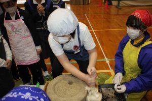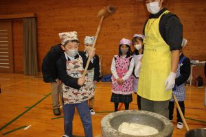 1月20日(火)篠山チルドレンズミュージアムの方に来ていただき、杵と石臼を使ったお餅つき体験。3年生が育てた黒豆を石臼で黒豆きな粉にひく体験。コマやメンコ、竹ボックルなどの昔遊び体験を、1~3年生で行いました。お正月にお餅つきをしていても、近年餅つき機ですることが多く、杵の重さにびっくりしていました。3年生が育てて炒った黒豆も、粗挽きのきな粉でとてもおいしかったです。昔遊びは、3年生がリーダーとなって、縦割り班で和やかに楽しんで遊ぶことができました。